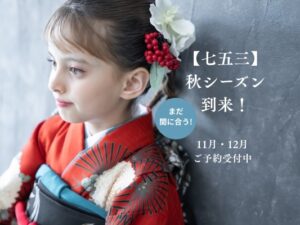 七五三ラストスパート! \まだ間に合う/ 11月12月ご予約受付中! いよいよ本シーズン突入いたしましたお子さまの成長を祝う大切な伝統行事 華やかな着物や洋装に身を包んだ姿は、家族にとって一生の宝物に この瞬間、この年齢